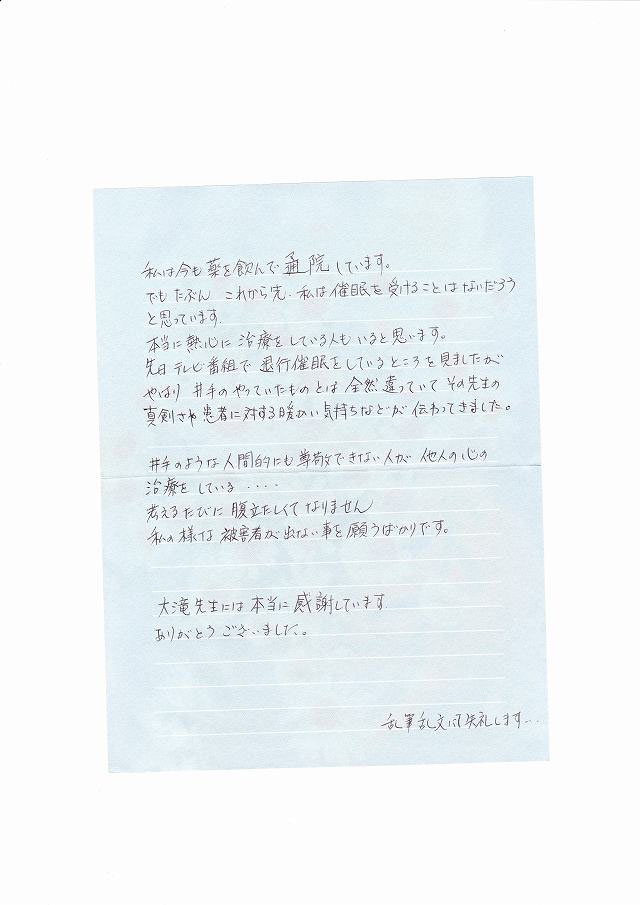 その内容は、お金を前納(その当時は315000円)させられて治療を始めたが、半分を過ぎても一向に効果が感じられなかったので「このまま続けてちゃんと治るんですか?」と質問したら激怒して「もうやる気を無くした。もう二度と来るな。お金も返さない」と言われ一方的に診療を打ち切られたというものだった。私は、出版社にかけあってあげたが「大滝先生もそうですが私共がお願いして出て頂いた先生なので私共からは言えないのをご理解下さい」という返事だった。極力親身になって相談に乗ってやって欲しいと要望して電話を切る時に「ちなみに、大滝先生は今回の事をどう考えていらっしゃいますか?」と訊くので「クライアント本人から「もう来ない」と言ったのならばまだしも、自分から来るなと言ったのならば半分は返すべきでしょう」と言うと「なるほど・・大滝先生はそうお考えになるんですね」と返してきた。私は呆れて「あの~、それって常識じゃないんですか?もしそれが通用するならば100回分と言ってお金を払わせて、一回目で相手に文句を言わせる様に仕向けて、文句を言ったら激怒して「二度と来るな!お金は返さない!」というやり方ができちゃいますよね!」と言って電話を切った。